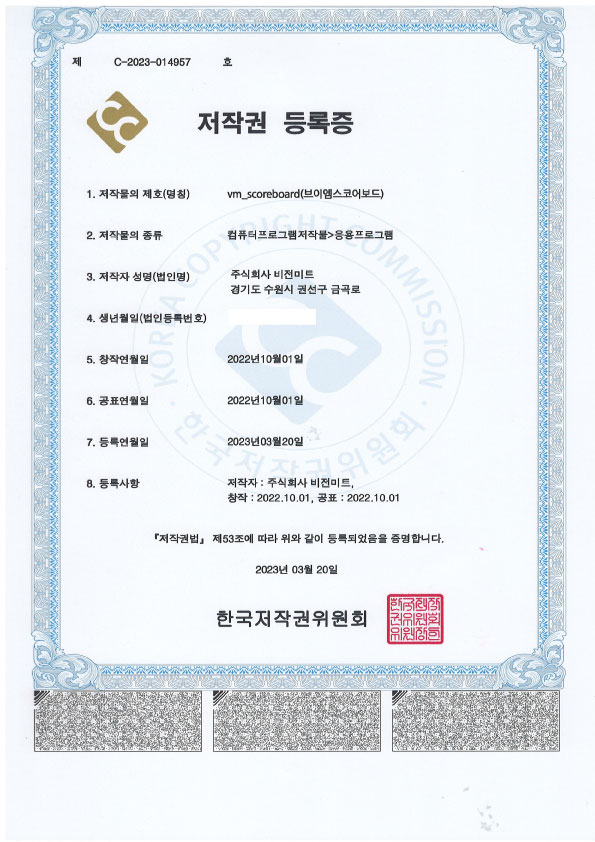 VM_SCOREBOARD 브이에스코어보드 저작권 등록증