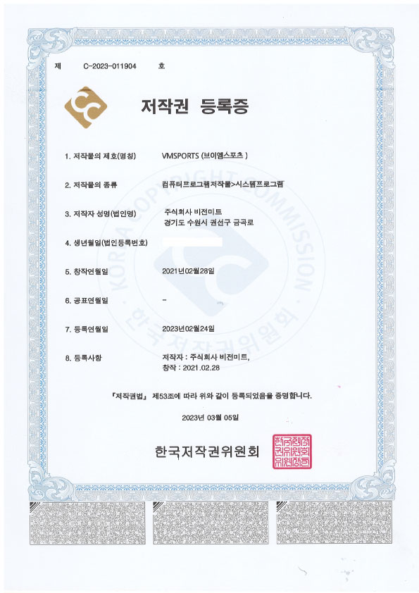 VMSPORTS 브이엠스포츠 저작권 등록증